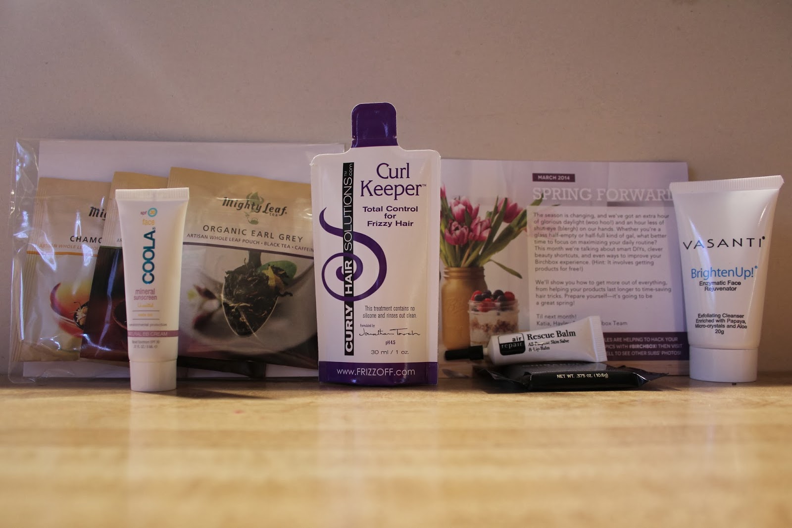 If you don't know about Birchbox, it's a subscription service. It costs $10 a month (less if you get a full-year subscription), and they send you 4-5 beauty items each month. They also have a points system, so if you review each item, you get 50 points every month, which is equivalent to $5 in the Birchbox shop. Since my birthday is in March, and they had a deal last month where signing up got you an extra 100 points (so you basically got the box for free), I figured I'd get an extra box for March too. Here's what I got: